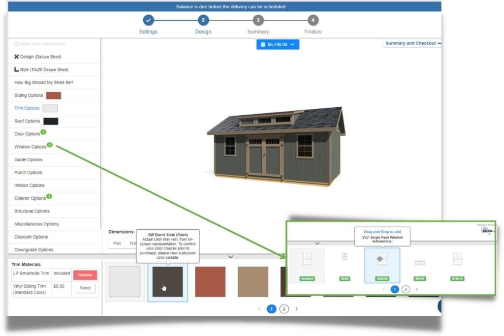ShedPro’s Design Studio shows detailed and realistic 3D models of sheds, tiny homes, and carports—most detailed in the industry. Changes to styles, colors, and features appear immediately on their user-friendly interface. Buyers find the interactive design approach makes customization easy.