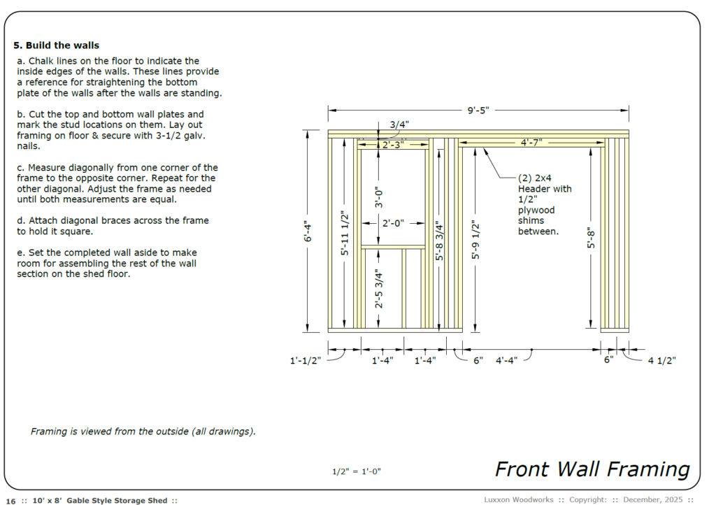 - Exact measurements and angles (stud spacing, rafter cuts, overhangs, and roof pitch)